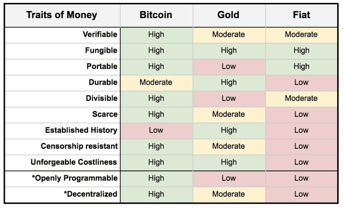 Se somarmos a escassez e outras propriedades como resistência à censura, programabilidade e descentralização, o bitcoin está próximo do tipo de dinheiro mais perfeito já criado, conforme destacado abaixo.