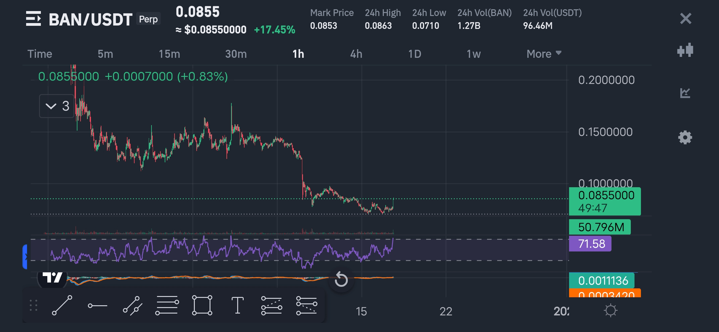 O valor do RSI está em 71,58, o que é território de sobrecompra (>70). Isso sugere que o ativo pode enfrentar pressão de venda ou uma correção em breve.