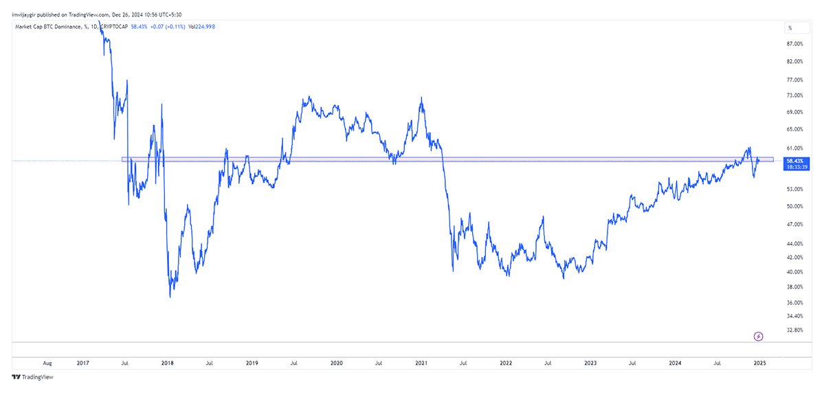 Dados históricos mostram que o preço do Bitcoin muitas vezes se move em contrariedade ao sentimento de mercado dominante. Quando a especulação altista aumenta, como chamadas para $110K, o Bitcoin tende a recuar. Por outro lado, o sentimento de baixa muitas vezes precede aumentos de preços. Atualmente, a dominância do Bitcoin em 58,43% sinaliza um forte interesse dos investidores, mas os preços podem precisar de uma fase corretiva antes de uma recuperação.