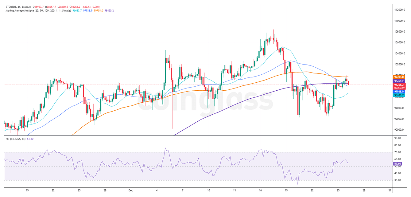 O movimento de mercado do Bitcoin muitas vezes desafia previsões, em grande parte devido ao desafio de interpretar os sentimentos do mercado. Atualmente, o Bitcoin é negociado a $98,268, ligeiramente acima em 0,08% nas últimas 24 horas. Tocou brevemente $99,950, mas foi empurrado para baixo pela média móvel de 100 dias (MA). A MA de 200 dias agora atua como suporte, embora um RSI em queda de 53,60 e um volume de negociação reduzido (-17,90%) sugiram um sentimento de baixa. Apesar de um Índice de Medo e Ganância de 79 (ganância extrema), o mercado se sente pessimista.