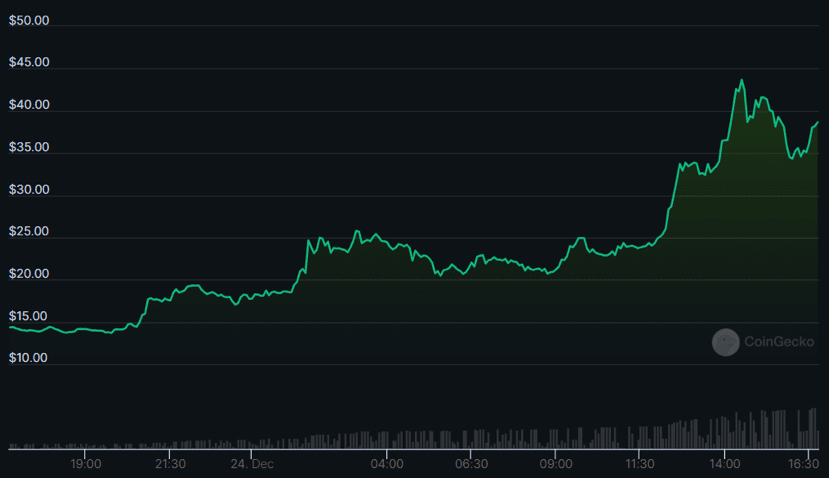O ativo finalmente disparou 146% em 23 de dezembro, rompendo vários pontos de resistência e fechando o dia em US$ 23.978.