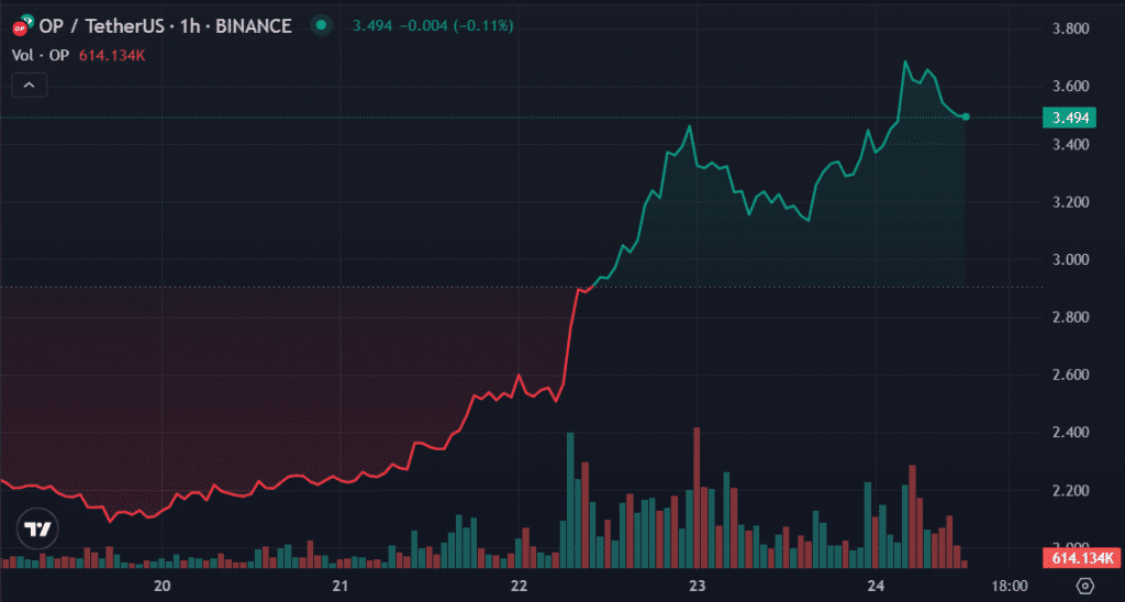 No entanto, o otimismo testemunhou um aumento da pressão de compra, atingindo um novo máximo histórico de US$ 3,842 hoje, antes de entrar em colapso. Apesar do colapso, o OP manteve-se acima do suporte de preço de US$ 3,5. O token subiu 65% hoje.