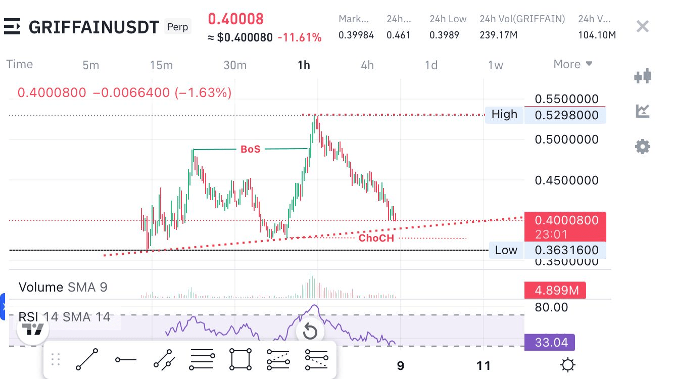 - Recuperação de Alta: Um possível rebote da zona de suporte próxima a $0.3631 se as condições de sobrecompra do RSI atraírem compradores.