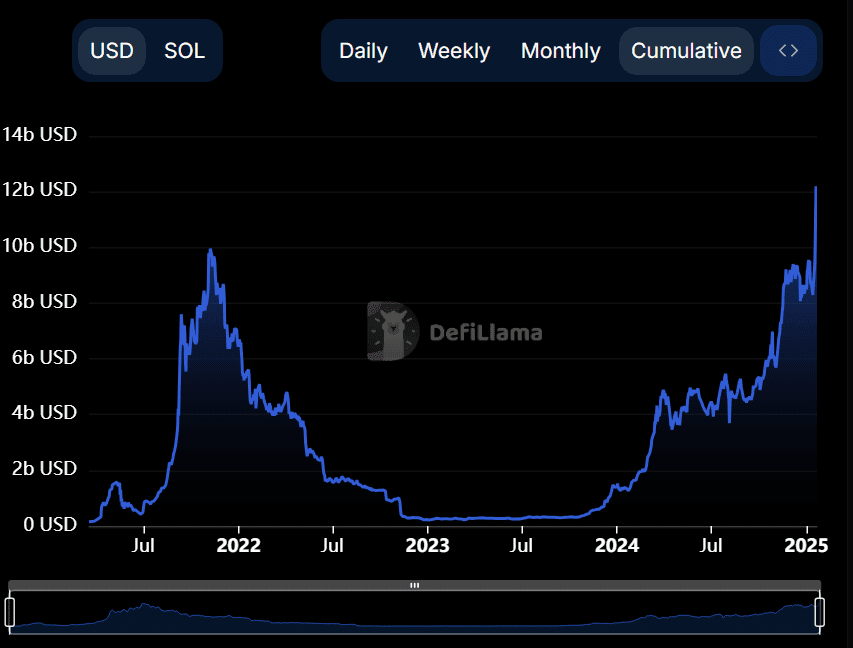 De acordo com dados do DeFi Llama, o valor total bloqueado da rede Solana (SOL) atingiu uma nova alta histórica de mais de US$ 12 bilhões em 19 de janeiro. Esta é a primeira vez que o TVL da Solana cruza o limite de US$ 10 bilhões desde novembro de 2022.