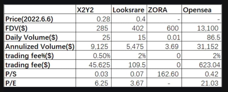 Em seguida, comparamos X2Y2 com ZORA e Opensea. Suponha que você concorde que a avaliação do Looks é semelhante à forma como a Crypto Native avalia as trocas NFT. Nesse caso, você também concordará que a avaliação do ZORA e do Opensea é idêntica à forma como o VC tradicional avalia projetos semelhantes. O PS do ZORA é 162,6 e o Opensea é 0,42 com uma relação PE de 21,03. A avaliação do ZORA é superfaturada. As instituições atribuem à Opensea cerca de 20 pontuações de índice de PE, 6,25 vezes as do X2Y2.