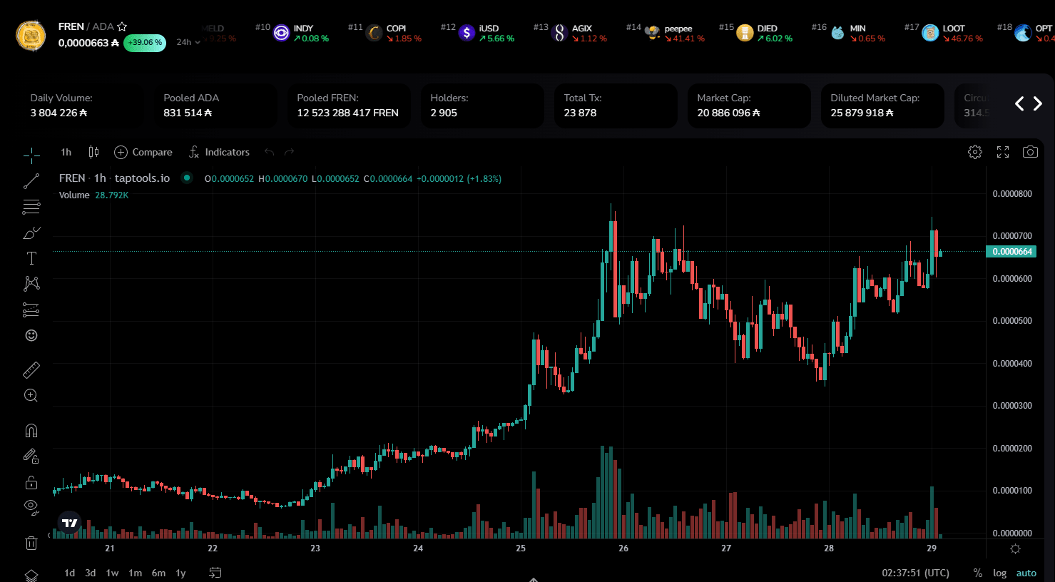 Mantendo esta trajetória ascendente, a FREN tem demonstrado consistentemente um volume significativo de transações diárias, alcançando milhões de ADA. Notavelmente, durante as recentes férias, o FREN ultrapassou o Snek em volume diário, garantindo uma posição notável como o segundo token nativo Cardano em volume diário de negociação. Em apenas oito dias de negociação, a FREN acumulou substanciais 28,41 milhões de ADA em volume de negociação em 22.443 negociações, equivalente a 1,471 trilhão de tokens FREN. O trader FREN mais lucrativo obteve um lucro de 78.535 ADA, com um lucro adicional não realizado de 10.135 ADA no momento da redação deste artigo. A impressionante jornada da FREN do 50º ao 19º lugar no TapTools atesta sua rápida ascensão no cenário competitivo da criptomoeda.