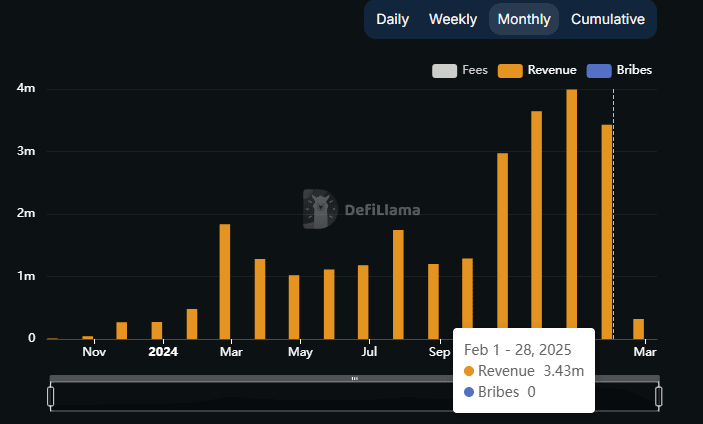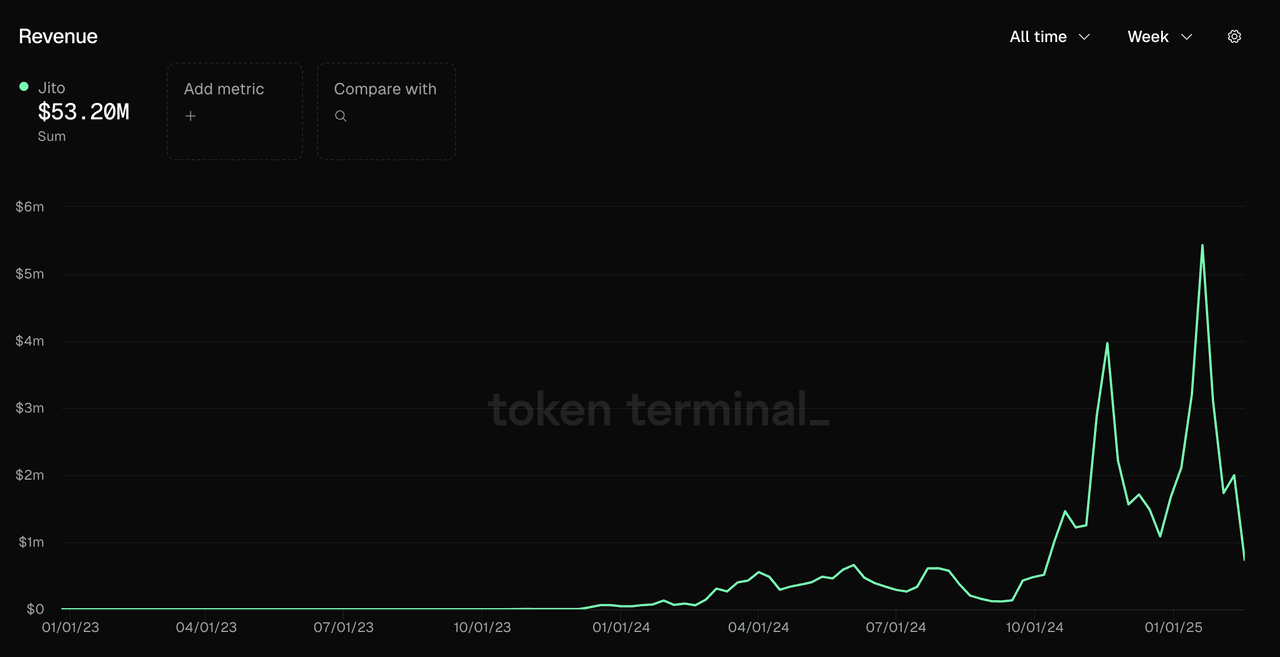 Pode-se ver que a receita da Jito está intimamente ligada à atividade na rede Solana. A partir de outubro de 2024, sua receita aumentou significativamente, ultrapassando 1 milhão semanalmente. Houve dois picos notáveis: em 20 de novembro e 20 de janeiro, quando a receita do protocolo da Jito atingiu 4 milhões e US$ 5,4 milhões, respectivamente, correspondendo a grandes ondas especulativas na cadeia. No entanto, conforme a atividade na cadeia Solana esfriou, sua receita diminuiu rapidamente.