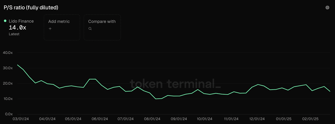 Com receita de protocolo de US$ 175 milhões, a relação preço/vendas (PS) atual da MKR é de cerca de 7,54, tornando-a relativamente mais barata em comparação com sua principal concorrente, a Ethena (22). Historicamente, a relação PS da MKR também tem sido consistentemente baixa.