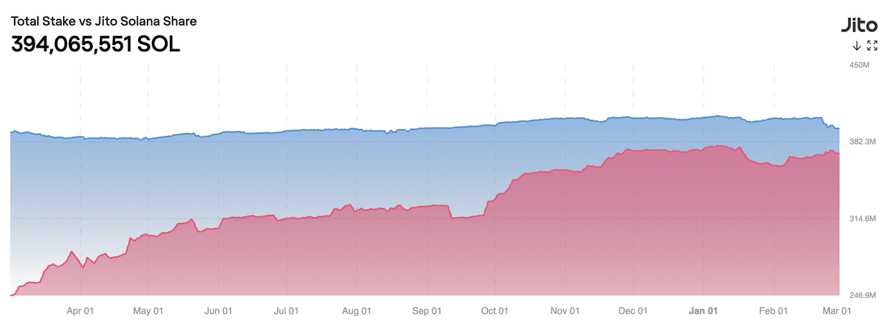 No domínio MEV, a Jito detém uma posição quase monopolista na Solana. Dos 394 milhões de SOL apostados, mais de 94% utilizam os serviços MEV da Jito.