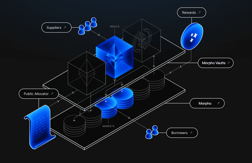 O produto inicial da Morpho visava aumentar a eficiência de capital para protocolos de empréstimo DeFi existentes, como Aave e Compound. Ele otimizou o uso de fundos depositando fundos de usuários nessas plataformas para ganhar rendimentos básicos e fundos correspondentes peer-to-peer com base na demanda de empréstimos.