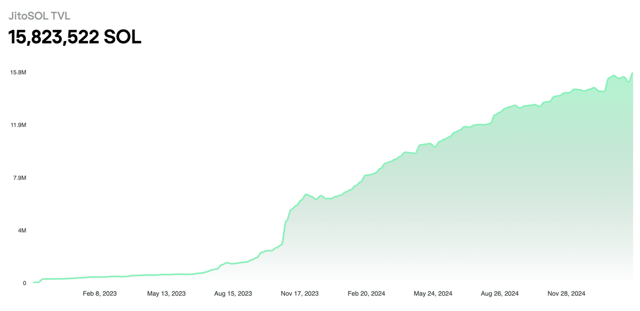 Em termos de SOL, a Jito apostou 15,82 milhões de SOL, o que é aproximadamente 3% do fornecimento total circulante de SOL. No ano passado, a quantidade de SOL apostada mostrou um aumento linear constante.