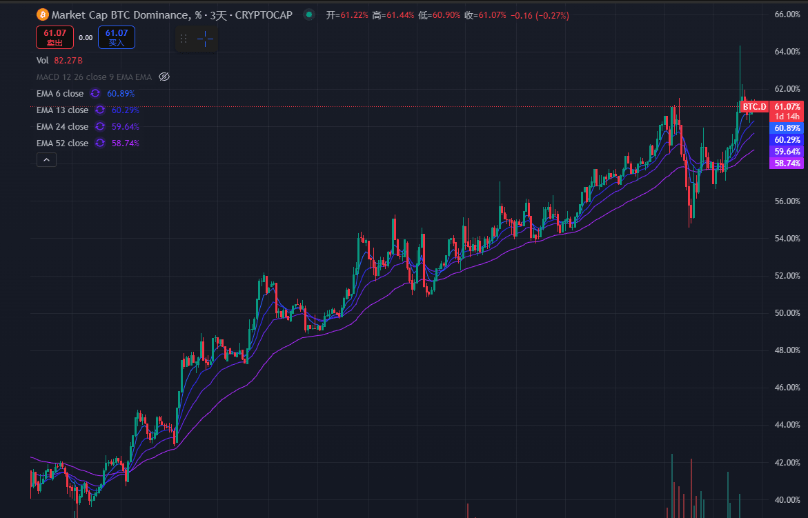 Ao contrário dos padrões históricos em que as altcoins aumentaram e o domínio do mercado do Bitcoin declinou rapidamente após as iniciações anteriores de bull market, o domínio do Bitcoin subiu constantemente de cerca de 38% em novembro de 2022 (o fundo do mercado) para mais de 61% hoje. Essa tendência persiste apesar do crescimento exponencial na oferta de altcoins durante este ciclo, destacando a fraqueza sem precedentes dos preços das altcoins.