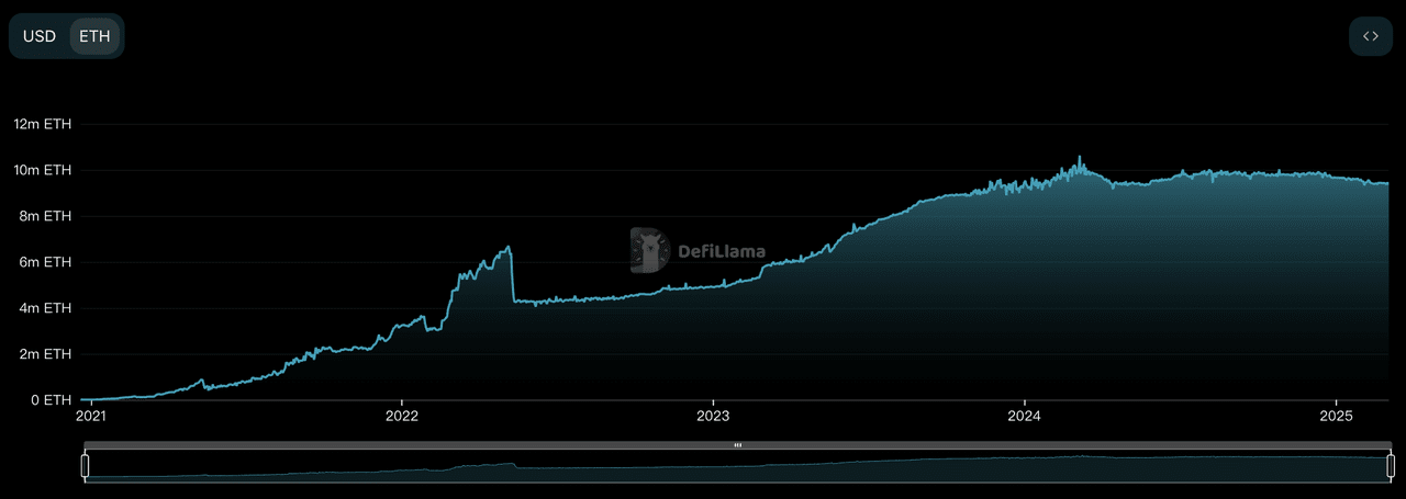 A flutuação no tamanho do ativo apostado, quando medido em ETH, é muito menor. Desde 2024, a quantidade de ETH apostada com Lido permaneceu relativamente estável. A maioria das mudanças no tamanho do ativo apostado de Lido são devido a flutuações no preço de ETH.