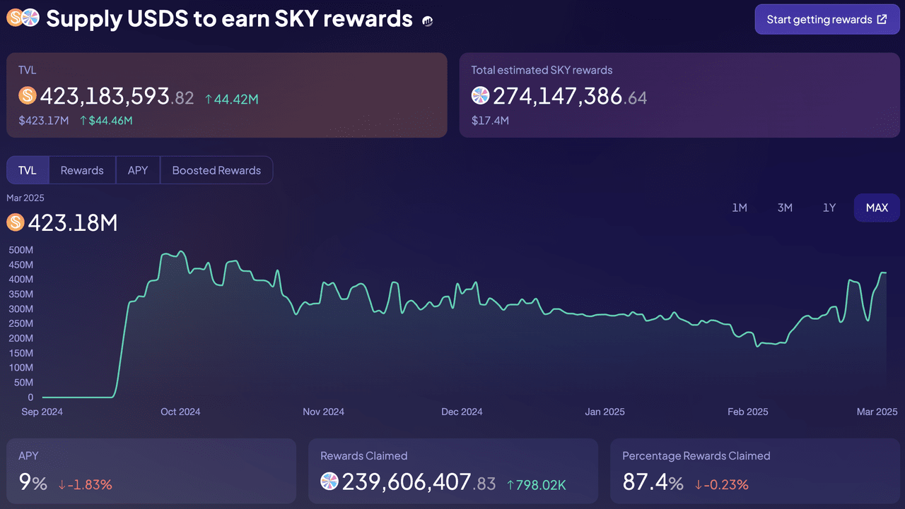 Um motivo para a recente atualização da marca MakerDAO é a falta de reservas adicionais de MKR para incentivar o crescimento de novos negócios. Atualmente, os incentivos de token da MakerDAO são usados principalmente para incentivar o depósito de USDS. Desde o lançamento do plano de incentivo no final de setembro de 2024, 274 milhões de tokens SKY foram distribuídos ao longo de cinco meses, o equivalente a 17,4 milhões, com um valor de incentivo anualizado de cerca de 42 milhões.