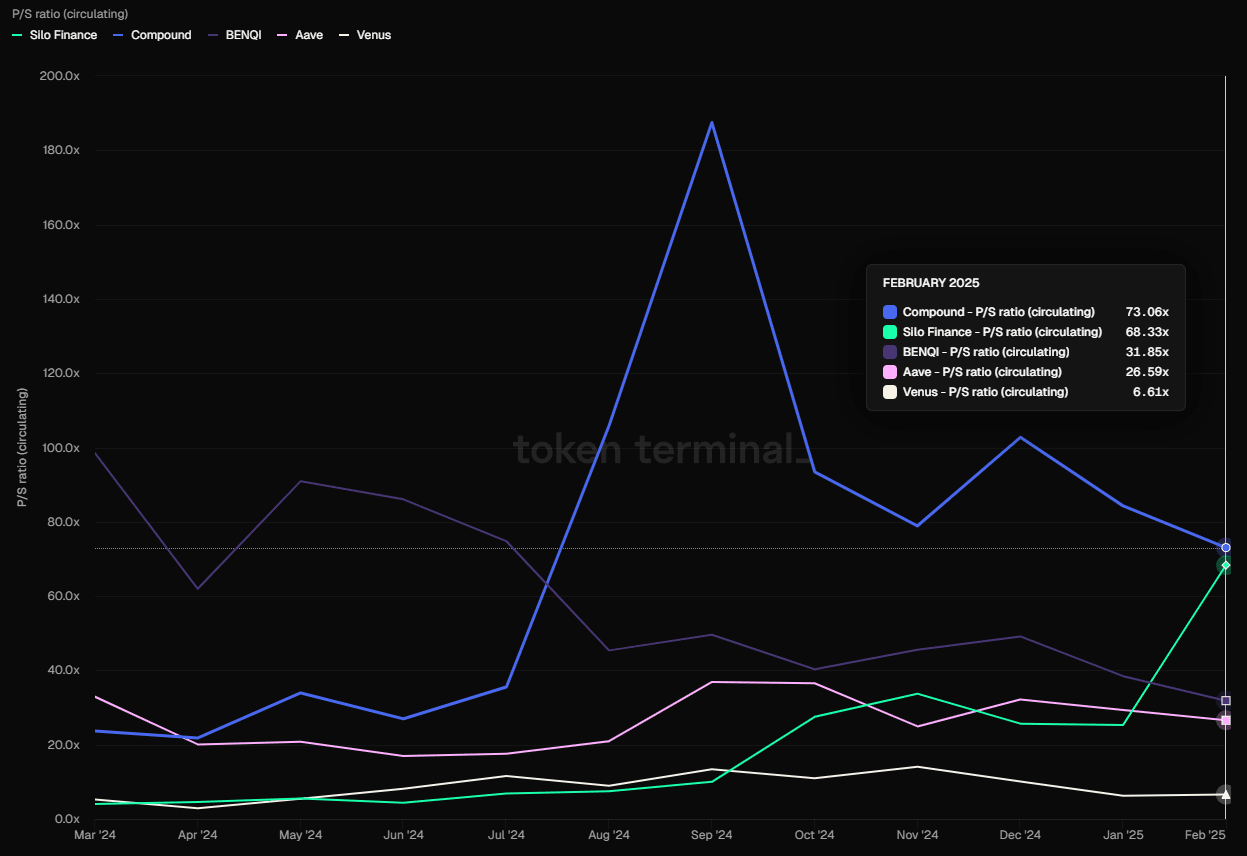 Quando comparado horizontalmente, a métrica PS do Aave é muito menor que a do Compound, Silo e Benqi, mas maior que a de Venus.