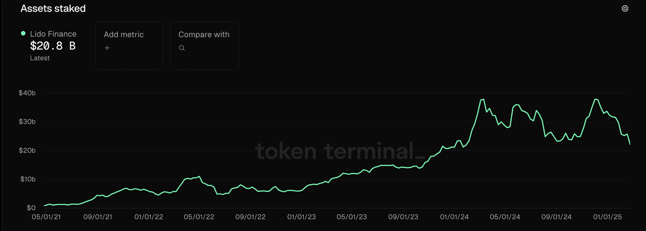Além disso, embora a taxa de staking atual de ETH esteja abaixo de 30% (em 28%), ainda há uma lacuna notável em comparação com outras cadeias PoS importantes como Solana (65%), ADA (60%) e SUI (77%). No entanto, a equipe Ethereum historicamente quis manter a taxa de staking abaixo de 30%, limitando a potencial expansão de mercado do Lido.