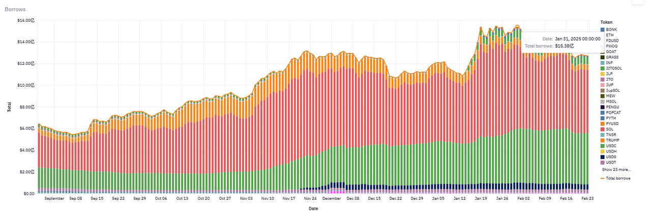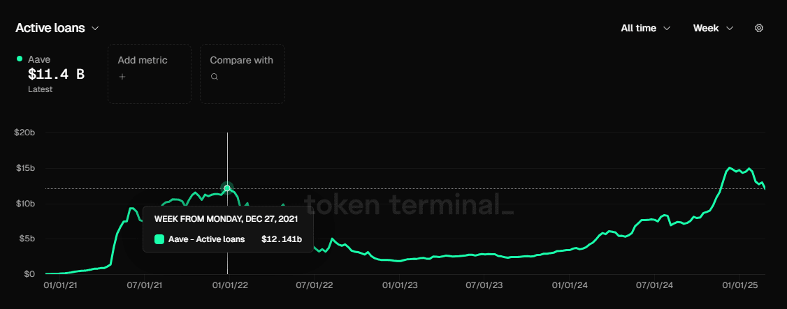 O volume total de empréstimos da Aave ultrapassou o pico de seu ciclo anterior (novembro de 2021) de 12,14 bilhões desde novembro do ano passado, atingindo uma alta histórica de 15,02 bilhões no final de janeiro de 2025. No entanto, como a atividade do mercado esfriou recentemente, o volume de empréstimos diminuiu e atualmente está em aproximadamente US$ 11,4 bilhões.