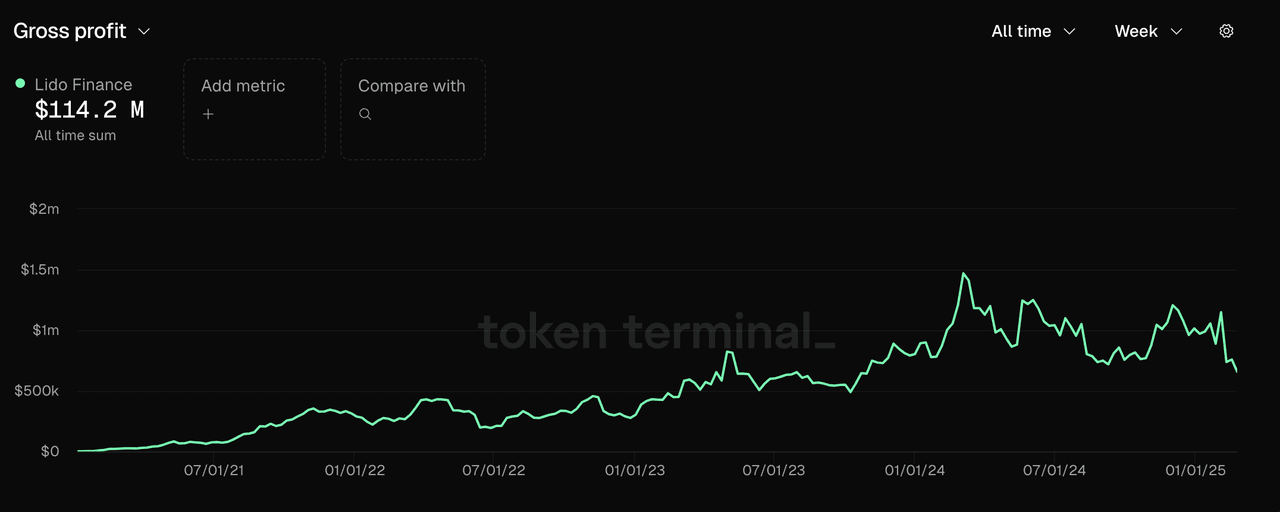 O Lido recebe 10% das recompensas de staking como receita do protocolo. Atualmente, essa receita é dividida, com 50% indo para os operadores de nós e 50% para o DAO, resultando em um lucro bruto de 5%. Conforme mostrado no gráfico abaixo, o lucro bruto do Lido aumentou constantemente. No ano passado, o lucro bruto semanal do protocolo Lido oscilou entre 750.000 e 1,5 milhão.