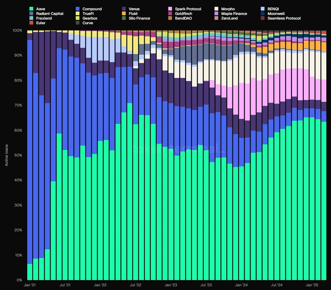 Em termos de volume de empréstimos (cadeias EVM), a participação de mercado da Aave permaneceu relativamente estável, mantendo consistentemente a primeira posição desde junho de 2021. No segundo semestre de 2023, sua participação de mercado caiu brevemente abaixo de 50%, mas desde o início de 2024, ela recuperou o ímpeto e agora está estável em torno de 65%.