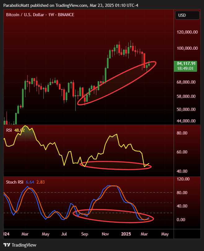 Para o analista Matthew Hyland, os atuais desenvolvimentos do mercado têm implicações ainda mais profundas. Pela primeira vez em seis meses, o Bitcoin parece estar formando uma divergência significativa de RSI bullish no gráfico semanal. “BTC pode criar sua primeira divergência bullish semanal desde setembro hoje à noite. Neste momento, está na posição perfeita,” observou Hyland.