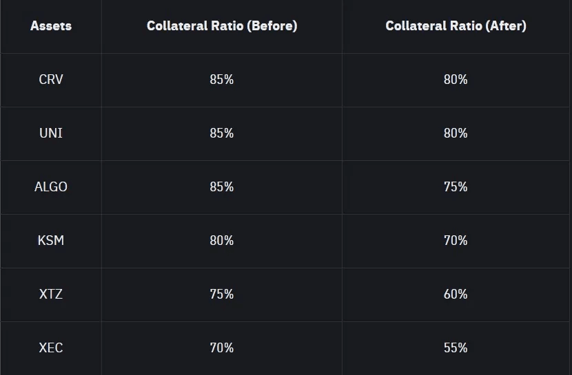 A Binance anunciou na segunda-feira que reduzirá as razões de colateral para CRV, ALGO, UNI, KSM, XTZ e XEC sob o programa 'Portfolio Margin'.