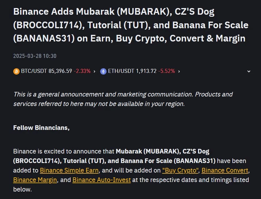Em 28 de março, a Binance integrou oficialmente os tokens MUBARAK, o Cachorro do CZ (BROCCOLI), Tutorial (TUT) e Banana For Scale (BANANAS31) em suas plataformas de negociação 'Earn, Buy Crypto, Convert & Margin'. Esta adição alimentou previsões otimistas sobre o potencial crescimento de valor.