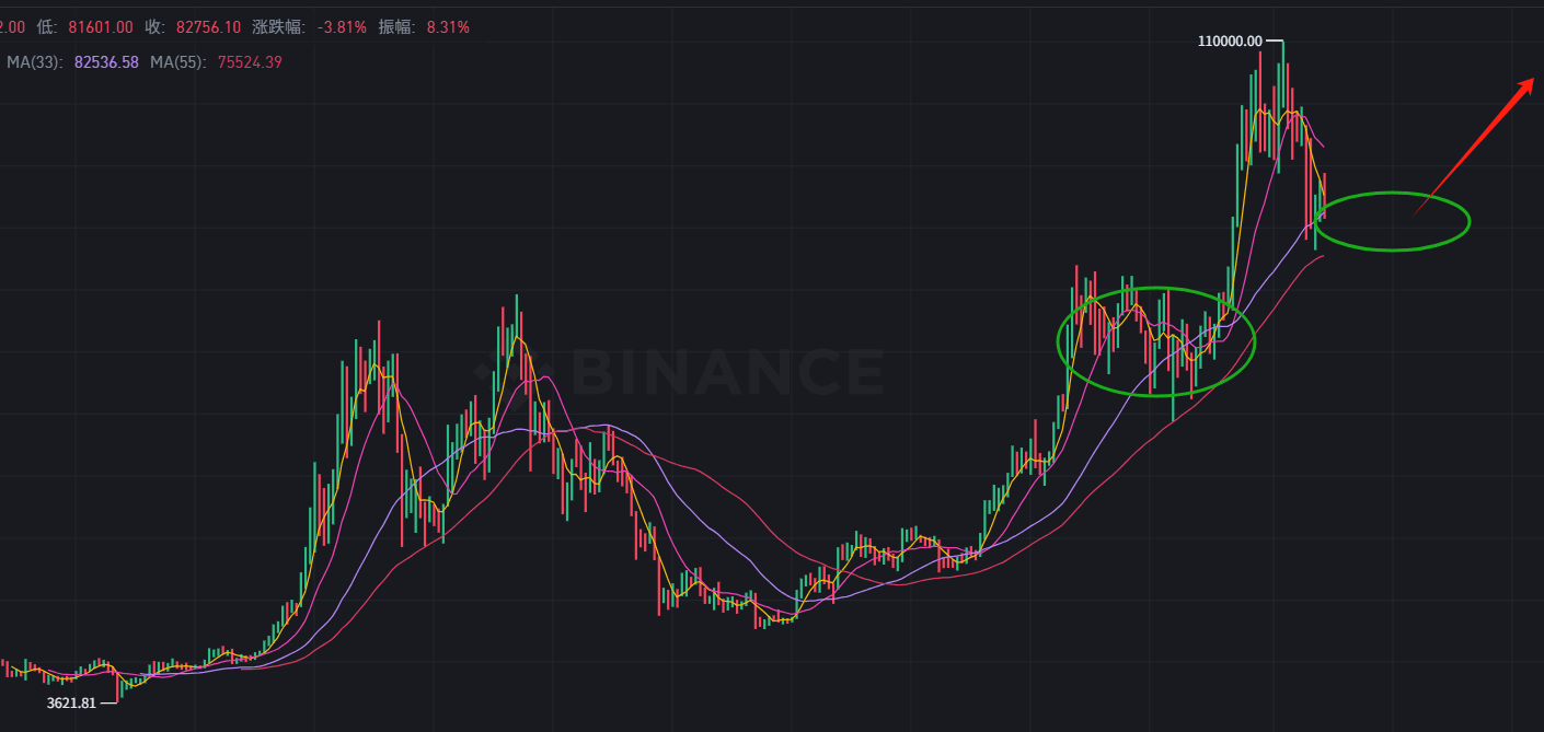 周线K线显示,2025年1月比特币创出约109K USDT的历史新高后出现了阶段性回调。目前价格仍运行在周线EMA30和200日均线(约等价于周线MA30-40)上方,中长期上升趋势线也保持完好,这意味着宏观上涨趋势尚未反转。