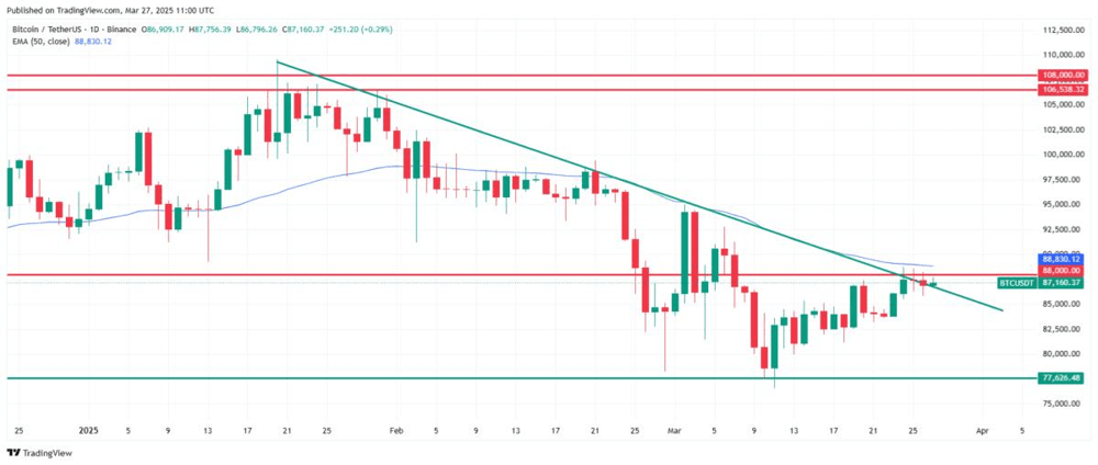 图1:BTC/USDT日线图(2024年12月至2025年3月)。