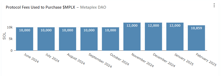 Atualmente, a principal utilidade do MPLX é a votação de governança. Além disso, desde março de 2024, a Metaplex anunciou planos para alocar 50% da receita do protocolo para recompra de tokens (embora na prática, o protocolo não tenha aderido estritamente a esse limite, com a maioria das recompras variando entre 10.000 e 12.000 SOL). Os tokens recompados são depositados no tesouro para financiar o desenvolvimento do ecossistema.