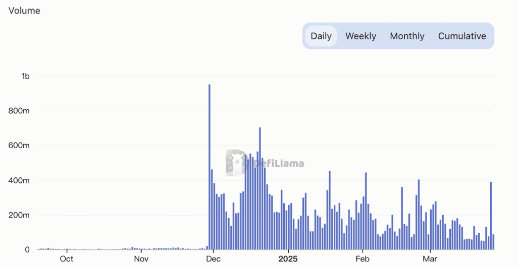 Como mostrado, as taxas de listagem da Hyperliquid experimentaram flutuações significativas. Embora tenham atingido quase 1 milhão de dólares em dezembro de 2023, desde então caíram para cerca de 50.000 dólares em meio ao entusiasmo de mercado em declínio para altcoins.