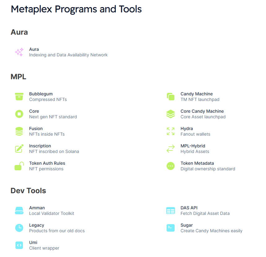 Em termos de serviços de ativos criptográficos, as ofertas da Metaplex podem ser divididas em duas categorias principais: Padrões de Ativos Digitais e Biblioteca de Programas (para emissão, vendas e gerenciamento de ativos). A primeira fornece aos emissores de ativos padrões de tokens que são altamente compatíveis com o ecossistema SVM e apresentam baixos custos de criação/gerenciamento, enquanto a última oferece um conjunto de ferramentas e serviços para criadores cunharem, venderem e gerenciarem seus ativos.