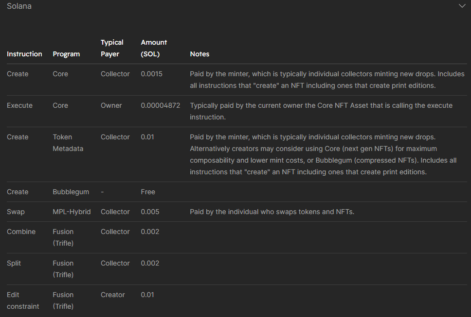 Embora a Metaplex ofereça uma ampla gama de serviços e produtos, nem todos são baseados em taxas. Um cronograma detalhado de taxas para serviços específicos é fornecido abaixo: