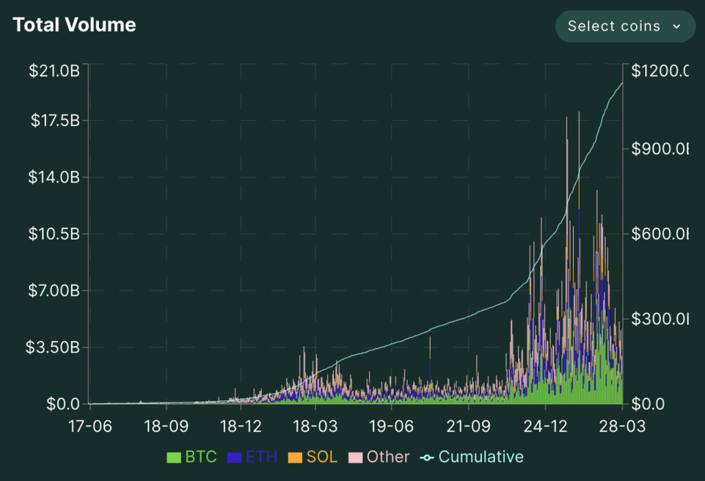 A plataforma de derivativos da Hyperliquid foi lançada de forma suave em junho de 2023, iniciou um programa de pontos em novembro de 2023 e viu um aumento no volume de negociação e no interesse aberto após seu airdrop oficial de token no final de novembro de 2023. Desde dezembro de 2023, o volume diário de negociação de derivativos da Hyperliquid tem uma média entre 4 bilhões e 7 bilhões, atingindo um recorde de um dia de 18,1 bilhões. O interesse aberto também aumentou acentuadamente, flutuando entre 2,5 bilhões e 4,5 bilhões desde dezembro.