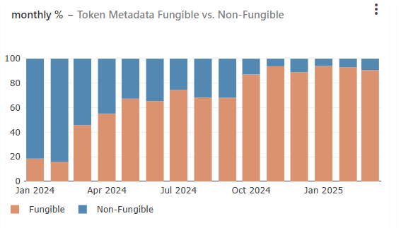 O gráfico acima ilustra a tendência na proporção de ativos NFT e FT que utilizam os Metadados da Metaplex (que fornecem dados adicionais para ativos digitais, como imagens, descrições, etc., e são usados por quase todos os ativos).