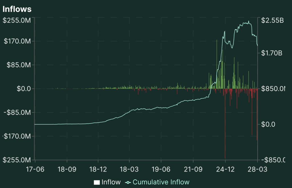 Os fundos custodiados da Hyperliquid começaram a aumentar em novembro de 2023 e desde então flutuaram em torno de 2 bilhões de dólares. No entanto, uma série de ataques recentes fez com que seu fundo custodiado parasse de cair de 2,5 bilhões de dólares para 1,8 bilhões de dólares em um curto período.