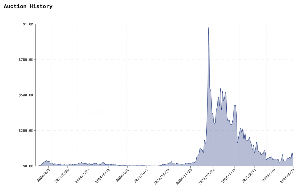 Além disso, a Hyperliquid emprega um mecanismo descentralizado (HIP-1) para listagens de ativos à vista, permitindo leilões públicos para elegibilidade de listagem. Os recursos desses leilões funcionam efetivamente como 'taxas de listagem' da Hyperliquid, cuja volatilidade é ilustrada no gráfico abaixo: