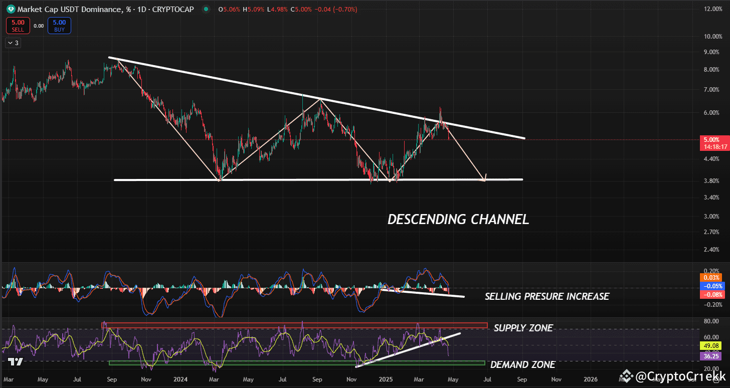 No intervalo de 1 dia para USDT.D, estou vendo uma rejeição da linha de tendência superior. Além disso, o RSI quebrou abaixo do seu nível de suporte, e o MACD está mostrando pressão de venda crescente.