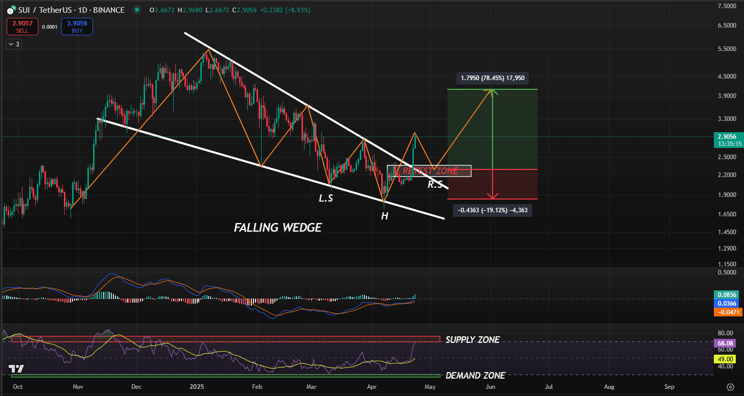 No intervalo de 1 dia, SUI quebrou um padrão de cunha em queda, que é um sinal de alta. Após um reteste bem-sucedido, pode ser uma boa oportunidade para abrir uma posição longa. Há também um potencial para a formação de um padrão de ombro-cabeça-ombro invertido, adicionando mais confirmação de alta.