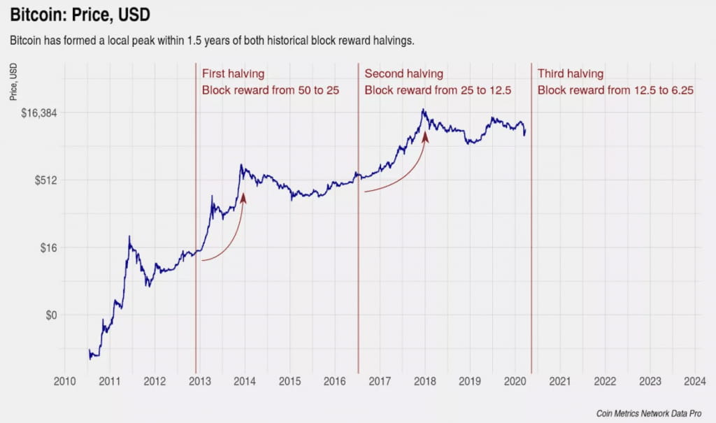 O primeiro halving ocorreu em novembro de 2012, onde a recompensa para cada bloco de transação concluído com sucesso caiu de 50 BTC para 25 BTC. O segundo halving ocorreu em julho de 2016, onde a recompensa para cada bloco de transação concluído com sucesso caiu de 25 BTC para 12,5 BTC. O terceiro halving ocorreu em maio de 2020, onde a recompensa para cada bloco de transação concluído com sucesso caiu de 12,5 BTC para 6,25 BTC.