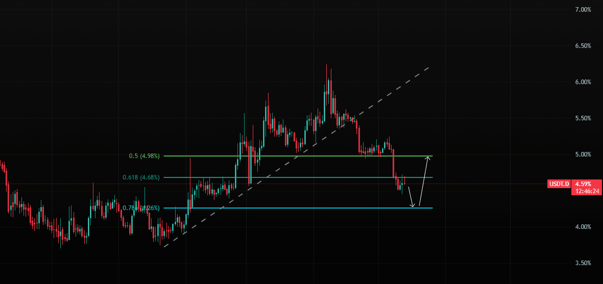 USDT.D ainda abaixo de 0,618, potencialmente a próxima parada deve ser a 0,786.