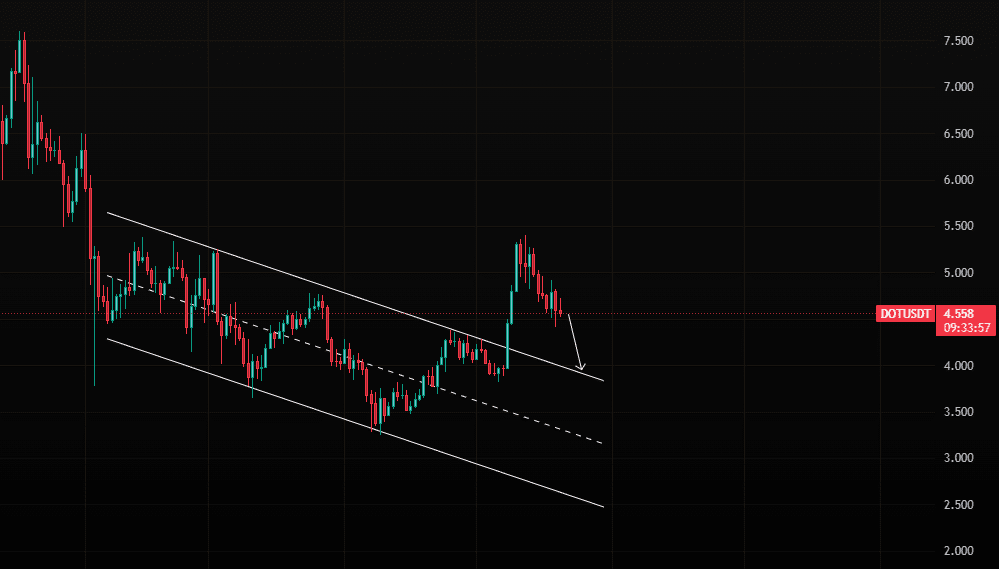 DOT pode cair mais em direção à área diagonal de suporte que foi anteriormente o canal descendente. Como todo o mercado está prestes a passar por uma correção saudável a médio prazo, podemos esperar que o DOT chegue à área que marquei. Entrar antes disso seria um jogo de tolos.
