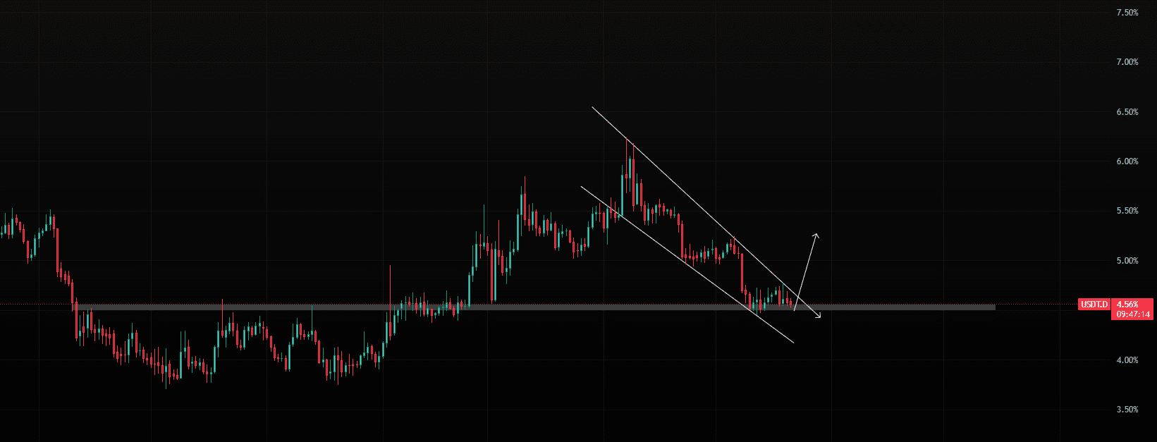 USDT.D parece estar em uma área que não deve ser mexida, se quebrada. Um rali significativo no mercado é esperado, mas é mais provável que vejamos uma correção em todo o mercado.