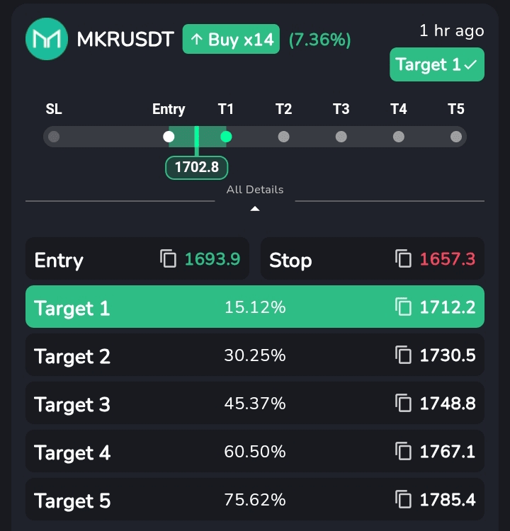 2. Target 1 Hit Hogaya: Pehla target 1712.2 hit hogaya, matlab signal already profit de raha hai.
