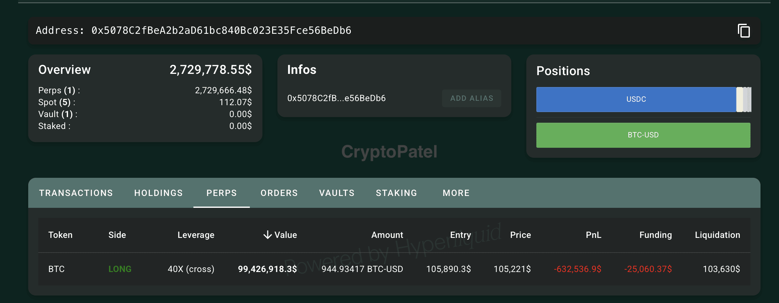 James Wynn estava a apenas $76 da liquidação quando o Bitcoin caiu para $103,700 — viver perigosamente! 😱