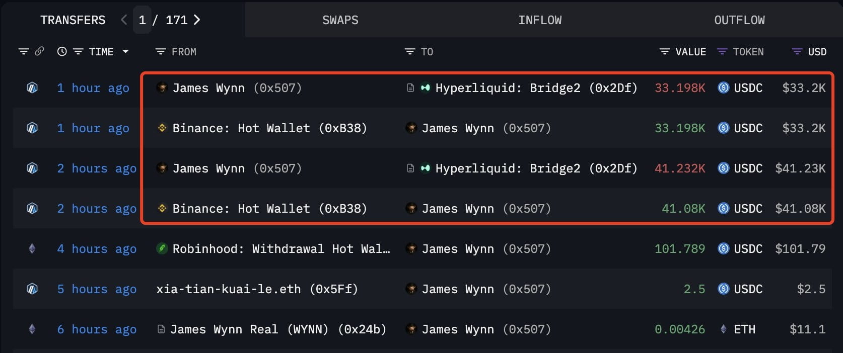 Logo antes da queda, JamesWynn fez um depósito de última hora de ~74K $USDC em #Hyperliquid para proteger sua posição.