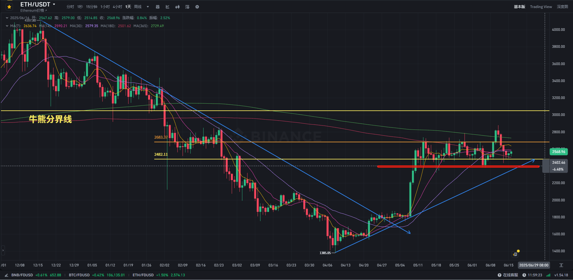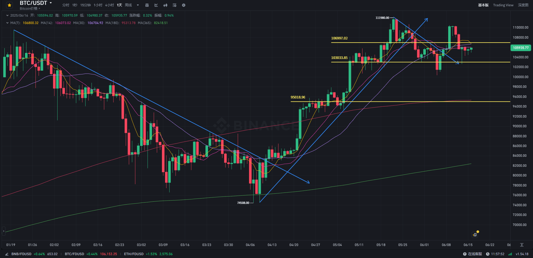 周线级别:收长上影阴线,跌破 7 周均线(105800 美元),创两月新低。17 日起美债到期虽理论释放流动性,但地缘风险或削弱资金流入。日线级别:受冲突影响下探 103000 美元,形成 “三针探底” 形态,200 日均线(102500 美元)成最后防线。上方 106500 美元(斐波那契 38.2% 回撤位)阻力强劲,需放量突破才能扭转颓势。4 小时级别:反弹量能萎缩 42%,显示抄底谨慎。日内关注 106500-107500 美元压力,104500-103500 美元支撑,破位需警惕加速下跌。