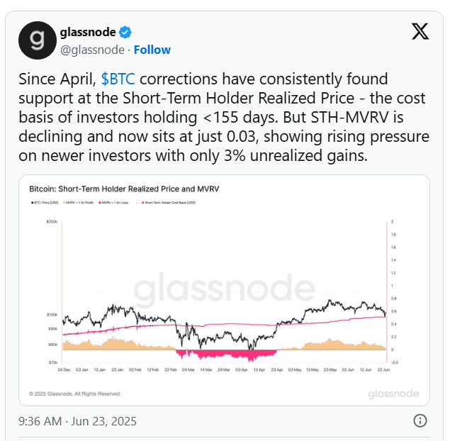 Enquanto o Bitcoin permanecer acima do STH-RP, a tendência de máximas mais altas e mínimas mais altas permanecerá intacta. Uma quebra abaixo desse nível, no entanto, pode sinalizar o início de uma possível correção.