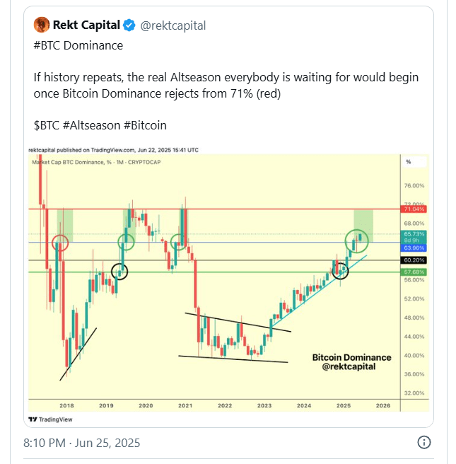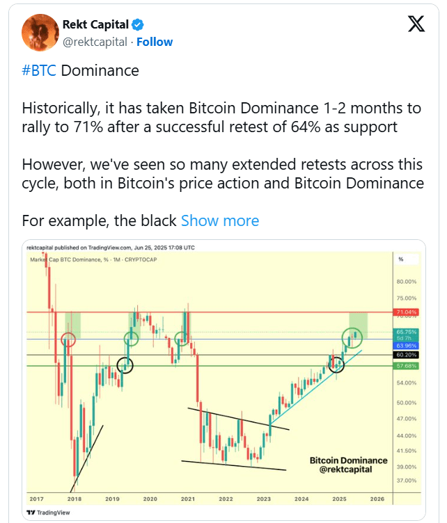Historicamente, quando o Bitcoin se recupera com sucesso do suporte de 64% de dominância, leva de 1 a 2 meses para subir para 71%. Este ciclo, no entanto, está mostrando uma escala de tempo mais longa: um salto semelhante que durou dois meses em 2019 se estendeu para quatro meses na fase atual, de acordo com o analista Rekt Capital. Ele observou que muitos traders estão esperando um salto rápido na dominância em direção a 70% para acabar rapidamente com esta fase do mercado.