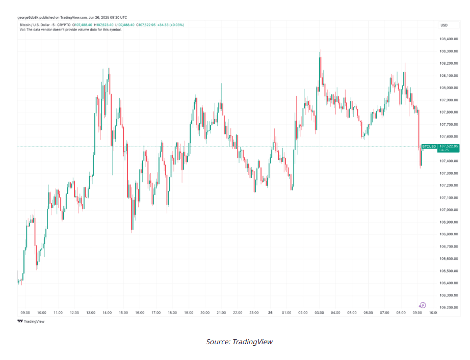 A principal criptomoeda tocou a importante marca de $108.000 várias vezes nas últimas 24 horas, mas sempre foi rejeitada. No momento, seu preço está flutuando em torno de $107.500, e ainda não se sabe se os touros conseguirão quebrar essa resistência para cima.