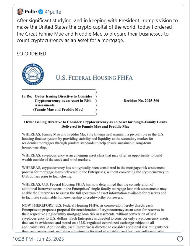 Ao mesmo tempo, o Bitcoin foi formalmente aceito como um ativo reserva pelo sistema habitacional nos Estados Unidos. Isso significa que algumas instituições relacionadas à habitação, como bancos ou credores hipotecários, agora consideram o BTC como uma forma confiável de valor para manter em seus balanços. Michael Saylor, um conhecido defensor do Bitcoin, chamou esse evento de “um momento divisor de águas” porque representa um passo importante em direção a uma maior adoção institucional do Bitcoin.